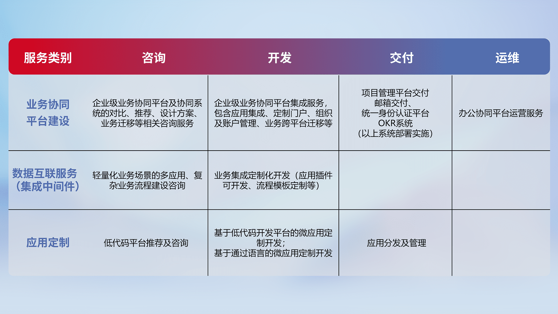 针对钉钉、、、、企微、、、IDaas等平台级产品提供产品的规划、、、方案、、交付、、定制化开发等服务,,,,实现如统一协同办公、、、、智能客户服务、、、混合会议管理、、、、智能数据查询、、、等业务场景,,,,实现数字化转型。。