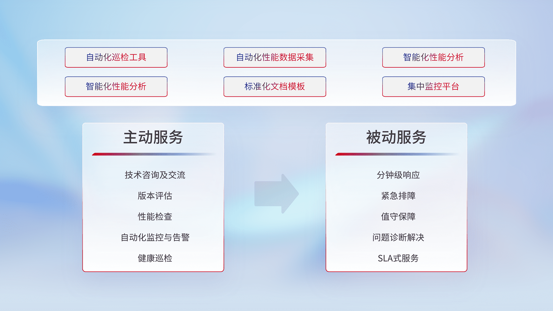 智能化工具和标准化文档,,保障服务质量,,,,提供主动服务(包含技术咨询、、、版本评估、、、、性能检查、、自动化监控与告警、、、、健康巡检)和被动服务包含(分钟级响应、、紧急排障、、、值守保障、、、、问题诊断解决、、SLA服务)。。。。